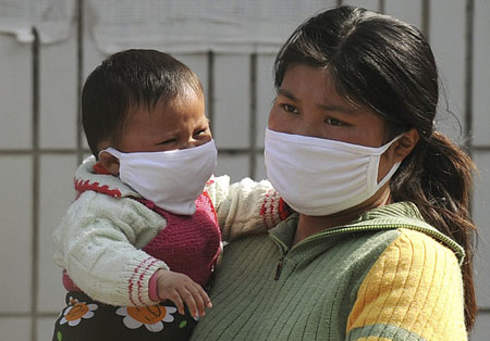 A woman and her child wear masks as they wait to see a doctor at a hospital in Fuyang, Anhui province April 29, 2008. [Agencies]