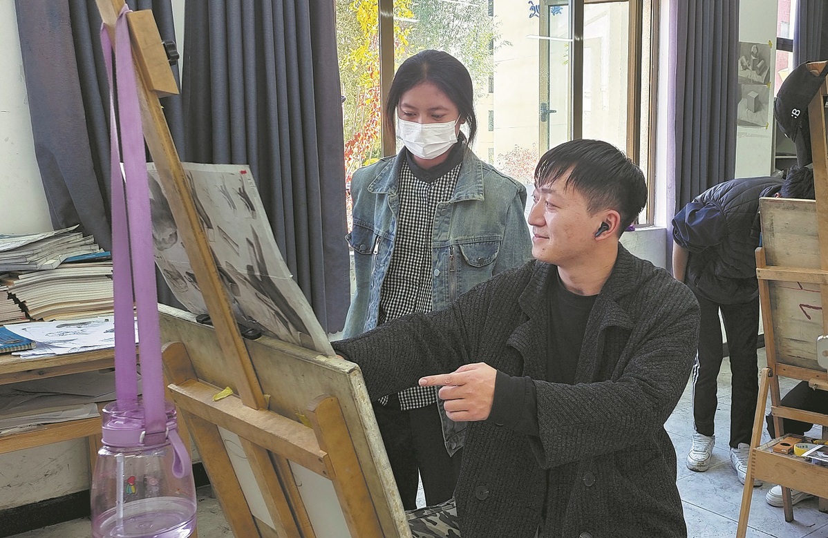 Yang gives guidance to a student during an art class in the school in 2023. [Photo provided to China Daily]