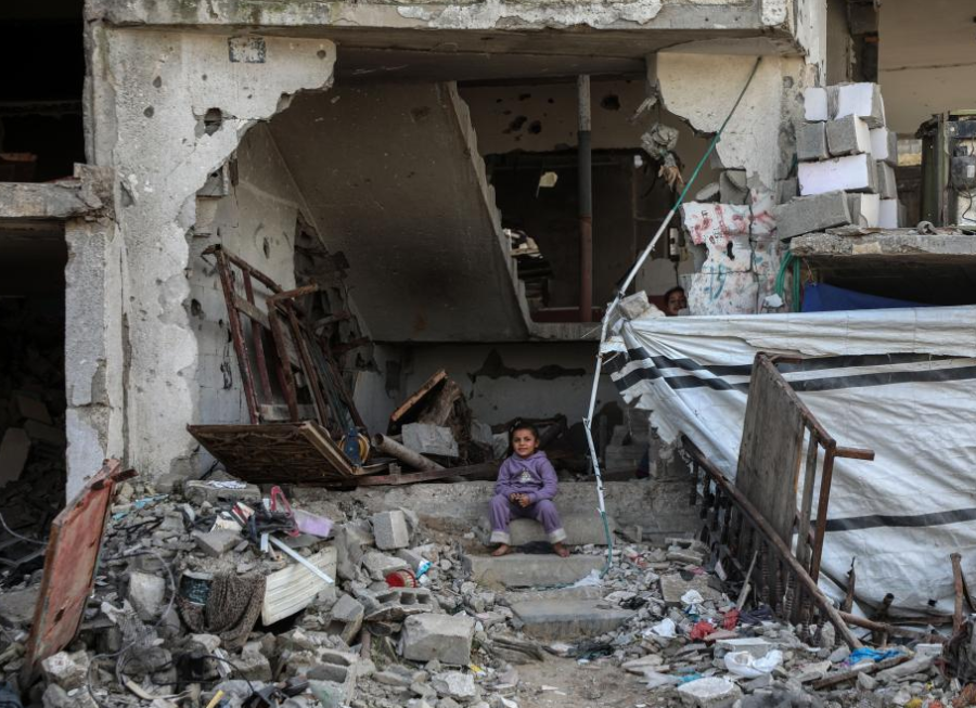 A child sits in a partially destroyed building in the Zeitoun neighborhood, southeast of Gaza City, on Jan 27, 2026. [Photo/Xinhua]