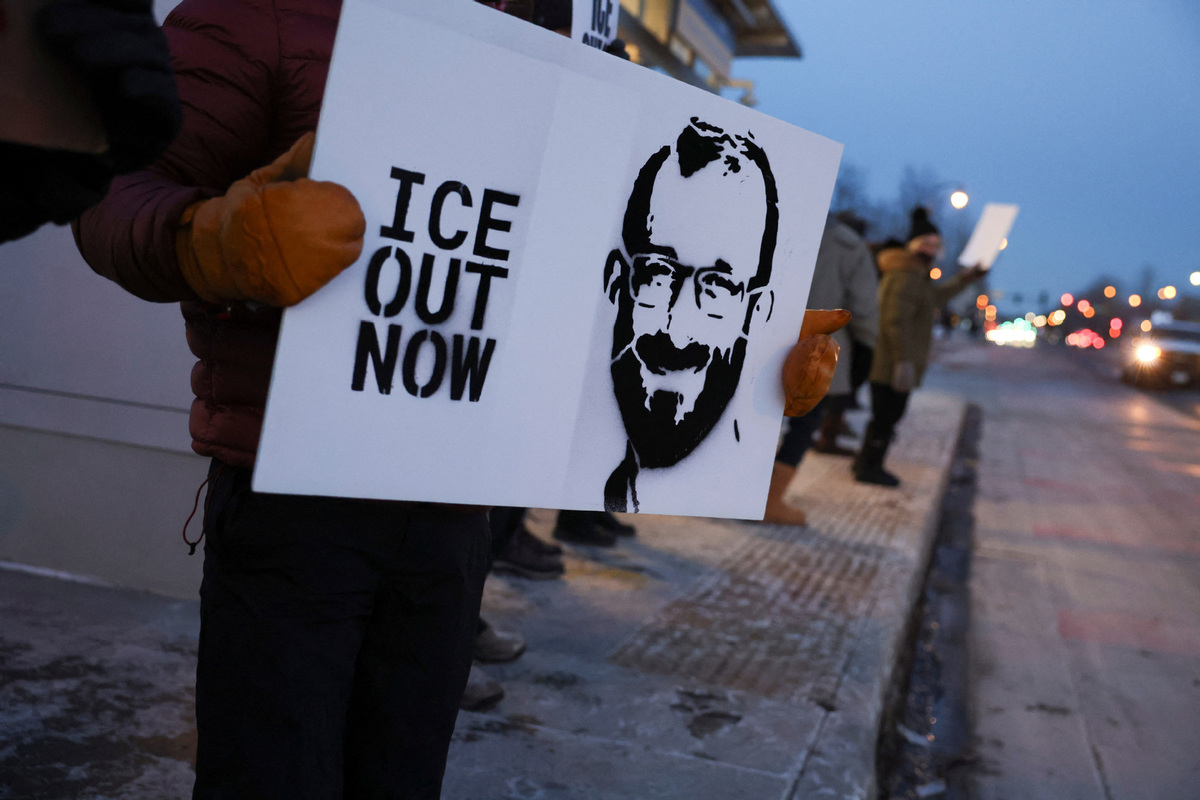 A demonstrator holds a stencil-graffiti of Alex Pretti, who was fatally shot by federal immigration agents trying to detain him in Minneapolis, during a protest against the presence of federal immigration agents in Minneapolis, Minnesota, US, Jan 28, 2026. [Photo/Agencies]