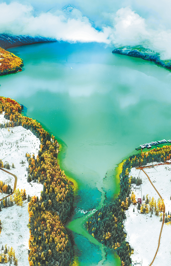 The emerald green with a milky hue adds a lively touch to Kanas Lake, whose landscape is covered in snow for most of the winter. This hidden gem in the northernmost corner of the Xinjiang Uygur autonomous region attracts visitors with its mythical charm. CHINA DAILY