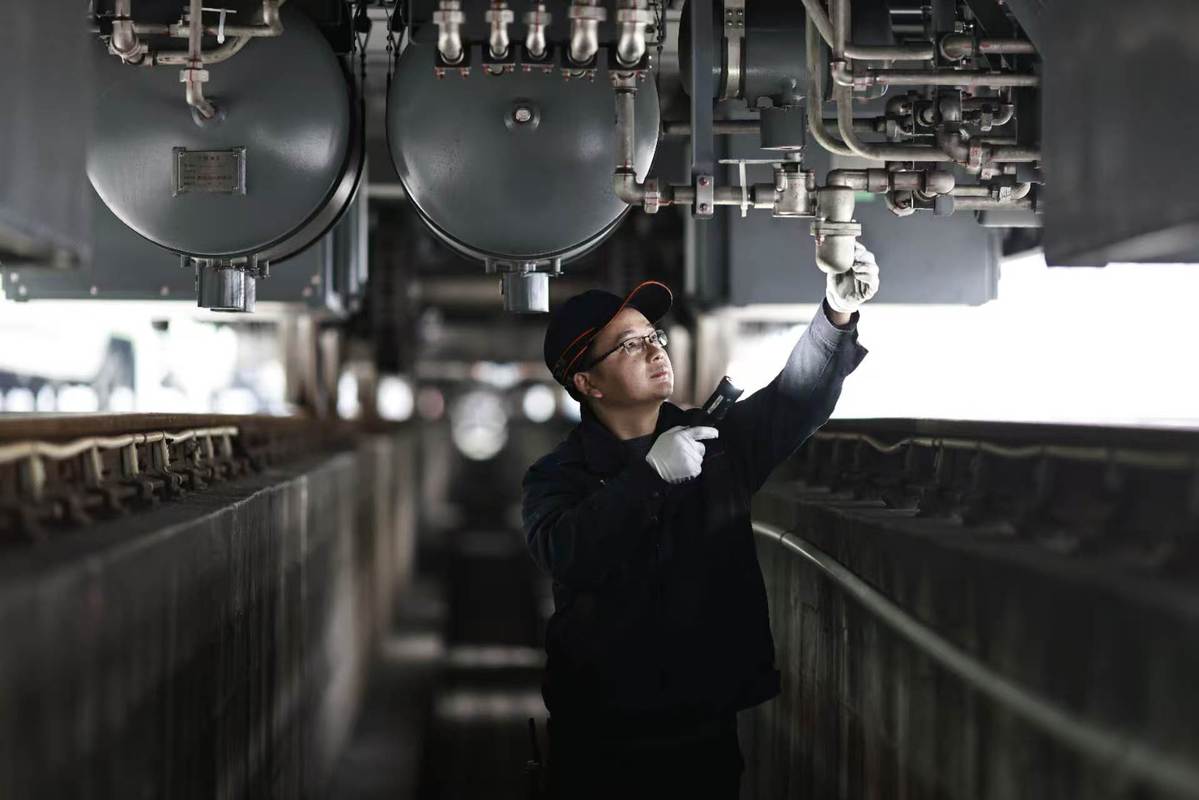 A maintenance worker checks a CR200J bullet train in Chongqing on Jan 29, 2026. [Photo by Su Zhigang/For chinadaily.com.cn]