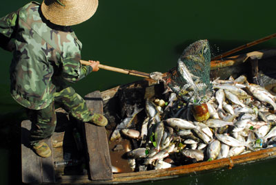A man collects dead fish from a river in Haikou, South China's Hainan Province July 23, 2007.[Newsphoto]