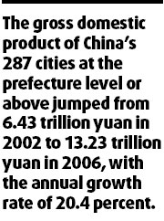 The gross domestic product (GDP) of the 287 cities jumped from 6.43 trillion yuan (US$855.7 billion) in 2002 to 13.23 trillion yuan (US$1.76 trillion) in 2006, with the annual growth rate of 20.4 percent. The proportion of the country's overall GDP increased from 53.4 percent in 2002 to 63.2 percent in 2006.