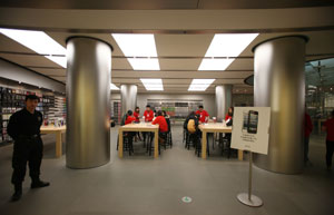 Employees at Shenzhen's newly opened Apple store cheer and give presents to customers as they enter the store on Nov 3, 2012. Apple opened its 7th store on the Chinese mainland in the southern boomtown of Shenzhen on Nov 3. Apple fans were enthusiastic about the new store, forming long lines before its opening. Some customers had to wait for half an hour before they could enter the store.