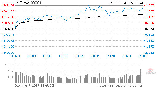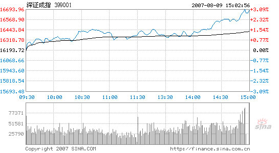 Updated: 2007-08-09 16:34 Chinese stocks shrugged off tightening warnings by the central bank and formed a strong upward trend today, with both major indices closing at record highs. Today, the majority of Chinese stocks resumed strong growth, although the pending July consumer price index (CPI) is estimated to grow a record 5 percent according to investment banks including Goldman Sachs, Credit Suisse, and Shenyin Wanguo Securities. Total turnover of the stocks enclosed by the major indices was 208.5 billion yuan, the lowest this month. Shanghai Composite Index ![]() Unlike yesterday's sluggish performance, saved from a slump by a single heavyweight blue chip, today the benchmark Shanghai Composite Index began marching upward immediately after opening lower from 4,658.59 and left the starting point behind as the lowest of the day. It hit the highest 4,768.89 soon after trading resumed in the afternoon session. After that, and following a few adjustments, the index finally ended at 4,754.10, up 90.93 points or 1.95 percent from yesterday's closing. Of the A shares listed in Shanghai, 447 went up today, while 278 closed down and 77 finished flat. Jiangxi Xinxin Industrial, rising 10.08 percent to 7.1 yuan, topped of the gainer's list, leading another 16 stocks that sealed the 10 percent maximum growth cap and 10 rising nearly 10 percent. Shanghai Kaikai Industrial, however, dropped another 9.99 percent to make the bottom of the list today. The Industrial and Commercial Bank of China, the largest trader both in terms of trading volume and transaction value and the only force that saved the index from losing 50 points yesterday, slowed today as analysts expected. It ended up 0.17 yuan or 2.67 percent by the closing. Shenzhen Component Index ![]() The Shenzhen Component Index, tracking the smaller Shenzhen Stock Exchange, mapped out a similar pattern. It opened higher from 16,194.04 and closed at 16,680.38, 486.65 points or 3.01 percent higher than the previous closing, also a new record-high close. The index went through the day between its opening point and a high of 16,691.87. Of the A shares, 341 went up, 202 closed down, and 79 ended unchanged. China Tungsten and High-Tech Materials grew 10.02 percent as the top gainer while Suzhou Good-Ark Electronics lost 10 percent on the other end of the league. The largest trader China Vanke rocketed 9.51 percent to 35.34 yuan. Stocks in the real estate, paper, and metal industries led the surge. Chongqing Yukaifa gained nearly 10 percent to pioneer the real estate shares on the rise. Wholesale and retail sectors were also strong. Closed-end mutual funds were up, with both indices surging over 1 percent. Of the 109 listed B-shares, 61 closed higher and 11 remained unchanged today. |