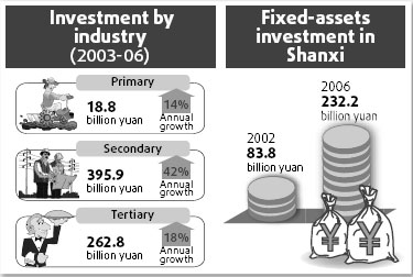 Updated: 2007-09-21 09:59 North China's Shanxi Province, which accounts for one-third of the nation's total coal output, has achieved rapid economic growth over the past four years as it develops its traditional industries and branches out into new areas. Investment in the province's key industries, including coal, coke, metallurgical and power, has increased 40 percent annually since 2003. Other industries in the province, such as chemicals, pharmaceuticals and construction machinery, have also seen increases of over 30 percent in investment, according to the National Bureau of Statistics (NBS).