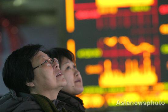 Investors watch stock quotes at a broker's trading hall in Changchun, Northeast China's Jilin province, on February 25, when Chinese A shares tumbled over 4percent on panic selling due to liquidity worries.[Asianewsphoto]