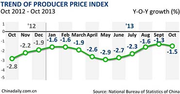 China's producer price index (PPI) fell 1.5 percent in October from the same month last year, the National Bureau of Statistics said Saturday.