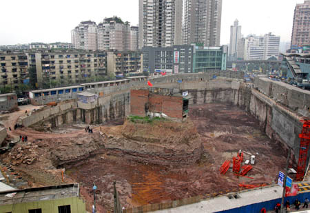 A Chinese national flag is raised atop a house, standing in the centre of a ten-metre-deep pit dug by the real estate developter, in southwest China's Chongqing Municipality, on March 21, a day before the deadline for the owner to move out sentenced by local court. The house' owner refused to go due to compensation disagreement with the developer. [newsphoto]