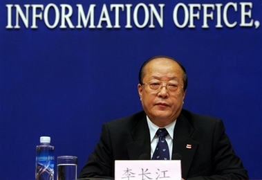 Li Changjiang, minister of the General Administration of Quality Supervision, Inspection and Quarantine, speaks to the media during a press briefing at the State council office in Beijing, China Friday, July 20, 2007. China's product safety watchdog said Friday that it had revoked the business licenses of several firms at the heart of food and drug safety scares and banned them from exporting their products. The actions by the General Administration for Quality Supervision, Inspection and Quarantine is the latest in a series of moves by Beijing to try to clean up its drug and food industries, which have been increasingly under the international spotlight after substandard Chinese goods have been rejected around the world as dangerous. [AP]