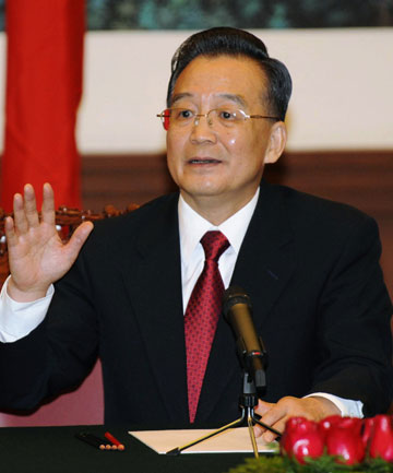 Chinese Premier Wen Jiabao talks at a joint news conference with Japanese Prime Minister Yasuo Fukuda at the Great Hall of the People in Beijing December 28, 2007. [Agencies]