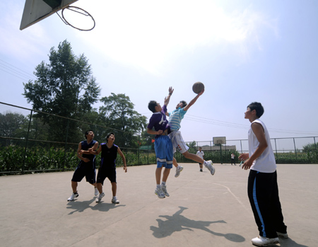 Students from earthquake-hit Sichuan Province play basketball on a PE class at a charity school in Changzhi, North China's Shanxi Province, July 27, 2008. Study and life are back to normal for 1,150 staff and teachers of Xuankou Middle school of earthquake-hit Wenchuan County after they were evacuated to a charity school in Changzhi. [Xinhua]