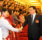 Eight women deputies to the First Session of the 11th National People's Congress (NPC) wave to reporters during a press conference at the news center of the session at the Great Hall of the People in Beijing March 8, 2008, the International Women's Day. [Xinhua]
