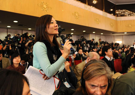 ![]() A journalist asks questions during a press conference on the sidelines of the 2nd session of the 11th NPC in Beijing, March 6, 2009. [Xinhua]