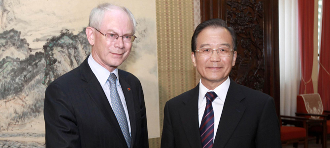 Chinese Premier Wen Jiabao met here Tuesday with visiting European Council President Herman Van Rompuy, pledging to further bilateral ties as "two major forces in advocating peace and development in the world."