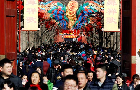 Crowds of tourists wander around the fair, Feb 8, 2016. [Zhu Xingxin/China Daily]