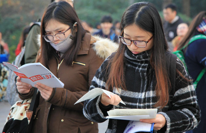 Two women review notes before sitting the 2017 China national civil service exam in Nanjing, East China's Jiangsu province on Nov 27, 2016.