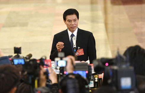 Members of the 12th National Committee of the Chinese People's Political Consultative Conference (CPPCC) Liu Changle (C), Feng Jicai (3rd R), Su Shishu (3rd L), Jackie Chan (2nd R) and Hai Xia (2nd L) attend a press conference for the fifth session of the 12th CPPCC National Committee on consolidating confidence in Chinese culture and telling stories of China and its people in Beijing, capital of China, March 7, 2017.[Photo by Wang Zhuangfei/China Daily]