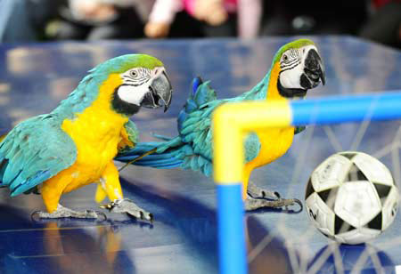 Two parrots play football during a performance at the Laohutan Ocean Park in Dalian, a port city in northeast China's Liaoning Province, on Friday, May 2, 2008. [Photo: Xinhua]