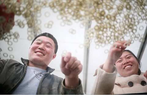 A worker makes Baipu yellow rice wine in a factory, April 4, 2016. [Photo/Xinhua] |
