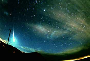 Meteor streaks across the sky in Shima, on the southernmost Japanese main island of Kyushu in the early hours of November 19, 2001. Many star gazers anxiously awaited the display of meteors after British astronomers said there would be an extraordinary number of meteors visible in East Asia including Japan. [Reuters]