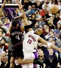 Carter was on the bench when Iverson's layup gave Philadelphia a 13-point lead early in the fourth quarter. Toronto followed with a 6-0 run, but Iverson, with Carter still on the bench, made another layup to make it a 10-point lead with 7:00 left.