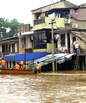 A house in the Juzizhou area in Changsha, capital of Central China's Hunan Province, is surrounded by flood water on May 18, 2003. [newsphoto.com.cn]
