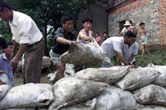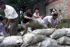 Villagers pile up sand bags in Huangtai Village, Yinshang County of East China's Anhui Province on July 6, 2003.[newsphoto.com.cn]