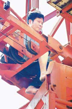 Sun Xuecheng sits on the top of a crane at a construction site in Nanjing, threatening to jump as his former neighbours try to calm him down.