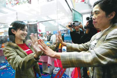 Bian Jing, a contestant in the online survival challenge, says goodbye to her mother as her 100-hour confinement in the glass room started on October 11. The event received a great deal of media publicity. [Xinhua]