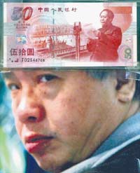 A yuan banknote featuring Mao Zedong is displayed at a foreign-exchange centre in Hong Kong November 18, 2003. [Reuters]