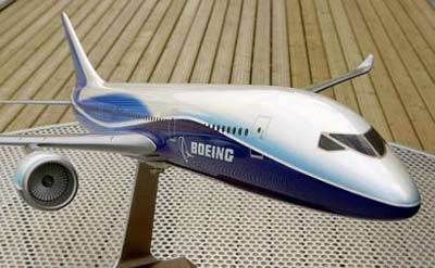 A model of the Boeing 7E7 dreamliner jet is displayed at the Paris Air Show at Le Bourget airport, June 18, 2003. [AP Photo]