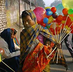 A woman sells balloons during a religious procession in New Delhi, India, Sunday, Jan. 4, 2004. Indian Prime Minister Atal Bihari Vajpayee called on the seven heads of state gathered in Islamabad, Pakistan, for a key summit to work together to fight poverty and improve the lives of their impoverished people, and pledged US$100 million to fund a poverty alleviation task force.  [AP]