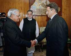 Indian Prime Minister Atal Bihari Vajpee, left, shakes hands with Pakistani President Gen. Pervez Musharraf as Pakistani Prime Minister Zafarullha Khan Jamali, center, looks on at the Presidential Palace in Islamabad, Pakistan, Sunday, Jan. 4, 2004.  [AP]