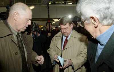 Charles 'Jack' Pritchard (C), the US State Department's former special envoy for DPRK, Sig Hecker (R), director from 1985 to 1997 of the Los Alamos National Laboratory, and John Wilson Lewis, a professor emeritus at Stanford University, arrive at Beijing Capital International Airport January 6, 2004 to leave for North Korea. [Reuters]