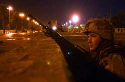 A U.S Army soldier takes his position during a night raid, in Tikrit, Iraq, early Friday, Jan. 9, 2004. U.S. forces arrested 13 Iraqis wanted in connection with planning funding and conducting attacks on coalition forces.  [AP]