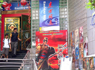 An Internet cafe in downtown Shanghai catches the attention of passers-by with large posters of computer games. Many Chinese fans of gaming are devoted to Internet games from the Republic of Korea. [newsphoto.com.cn]