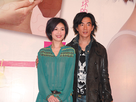 On March 2, Bi Xiaoshi (first from right), GM of Ocean Butterflies Music in Beijing, and contract singers celebrate with their investor representative Li Jianguang (fifth from left) from IDG-ACCEL, a joint venture of American International Digital Group and Accel Partners. | |  Miriam Yeung and Richie Jen, pop singers and movie stars from China's Hong Kong and Taiwan, show up at a press conference promoting their new movie "2 Becomes 1" in KunTai Royal Hotel on Monday. | |