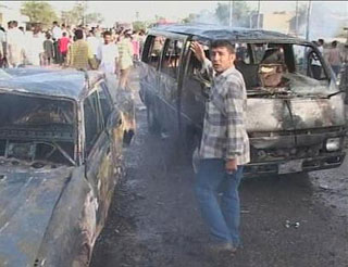 At one station in the Saudia district of Basra, four vehicles were seen destroyed including two school vans that were passing that station at the time of the attack. One was carrying students from a girls' middle school and the other carried kindergarten students.