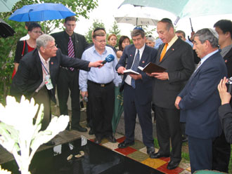 Israel's Deputy Prime Minister Ehud Olmer (2nd R) stands in front of his grandfather's grave at Harbin Huangshan Jewish Cemetery June 25, 2004. [newsphoto]