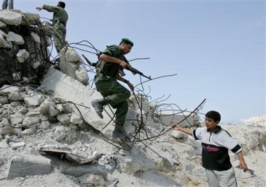 The confrontation came hours ahead of a midnight deadline for all Jewish settlers to leave the Gaza Strip voluntarily or face forcible removal. Officials said they were hopeful many settlers would leave the area before the deadline, but also issued a stern warning of tough action against anyone who resists. "We will make every effort, the army and the police, to have law and order in this process and anyone who acts illegally will be treated according to the law," Defense Minister Shaul Mofaz told a news conference. He said he expected at least half of Gaza's 8,500 residents to be out by midnight. The three-week operation to evacuate Gaza began Monday with the distribution of eviction notices. Israel plans to remove all 21 settlements from Gaza and four from the West Bank. It is the first time Israel has removed veteran settlements from either area, which are claimed by the Palestinians for a future, independent state. On Tuesday, Palestinian militants marched through the streets of a town in southern Gaza flanking the settlements, and vowed the Israeli withdrawal would be the first step toward eliminating Israel. By midday, three Gaza settlements and two West Bank communities were empty, while five other Gaza settlements rapidly thinning out. But residents and their supporters in several communities appeared to be digging in for a fight. Jewish settlers have vowed to resist the pullout peacefully. But officials estimate some 5,000 Jewish extremists from outside Gaza, many of them fervently religious teenagers, have infiltrated the settlements in recent weeks. After failing to enter Gaza's largest settlement, Neve Dekalim, on Monday, police moved in early Tuesday and dismantled the main entrance gate to clear the way for some 120 moving trucks to enter. Officers used an electric saw to cut through the gate, then dragged the metal barrier away and threw it on the side of a road. Within hours, a large crowd of predominantly young people gathered near the gate and refused to let the trucks enter the settlement. When security forces tried to push back the crowd, scuffles erupted. Protesters wearing the orange color of pullout opponents pelted police with plastic water bottles while security forces put a water cannon on standby. Police said they detained at least nine youths, and carried off several flailing settlers by grabbing them by their arms and legs. More than an hour later, traffic remained at a standstill. "If the settlement is struggling to survive, then everybody should stay," said Libby Weinberger, a U.S.-born Israeli who came to Neve Dekalim from the Israeli town of Raanana. As the standoff continued, a family of settlers tried to leave Neve Dekalim in a jeep carrying four mattresses on the roof and pulling a small trailer. A young girl inside was crying as the crowd prevented the vehicle from moving. Avner Shimoni, a leader in the Gush Katif settlement bloc, said leaders supported the right of anyone to leave voluntarily. Much of the opposition appeared to be coming from outsiders who have evaded army roadblocks and infiltrated Gaza in recent weeks. Police spokesman Avi Zelba said about 500 people illegally in Gaza were arrested overnight, and dozens were caught trying to enter from Israel. Brig. Gen. Gershon Hacohen, the army commander in the settlement, said the standoff was a sign of what lies ahead. "There will be places where it will be easier and there are places where it will require many more forces," he told Israel TV. In the isolated Gaza settlement of Morag, leaders screamed out codewords over a loudspeaker ordering residents to go into hiding 錕斤拷 preparations for the arrival of Israeli troops. About one-third of the settlement's 220 residents had left by early Tuesday, and many others were packing up. However, the army said an estimated 300 hardline outsiders remained holed up in the settlement. Elsewhere in Gaza, residents of the Bedolah settlement torched three cars and vowed to burn down their houses ahead of the withdrawal. In central Gaza, the hardline settlement of Netzarim showed no signs of preparing to leave. Residents spent the night in a communal celebration, singing and dancing and waving orange flags. "The party was the focus of many energies that exploded out ... Here it explodes with happiness," said resident Eyal Vered. In a televised speech Monday evening, Prime Minister Ariel Sharon praised Gaza's settlers as "pioneers," but insisted that it is time for Israel to leave the area after 38 years of occupation. "We cannot hold Gaza for good," he said. "More that a million Palestinians live there, doubling their numbers every generation." Sharon also urged Palestinian leaders to control extremists. "To an outstretched hand of peace, we will respond with an olive branch, but fire will be met by fire more intense than ever," he said. In the Palestinian town of Khan Younis, Palestinian children rushed toward the wall of a nearby Jewish settlement and placed a flag from the Hamas militant group on it 錕斤拷 prompting Israeli soldiers to fire warning shots. Palestinian police struggled to keep the children away from the wall, an almost daily occurrence this last week. The Hamas rally in southern Gaza occurred as some 2,000 people, most of them children and teens, marched through town to celebrate Israel's pullout from Gaza. Also marching were some 200 hundred masked gunmen carrying rocket launchers and machine guns. "This is only the first step to liberating all of Palestine including Jerusalem east and west and every inch of Palestinian land from the sea to the river," said Hamas spokesman Younis al-Astal. Hamas and other militant groups have been seeking to portray the Israeli withdrawal, which got underway this week, as a victory for violent resistance. Israel fears that perception could lead to further militant attacks after the pullout, undermining efforts to jump start Mideast peacemaking. Palestinian leaders have vowed to maintain law and orde