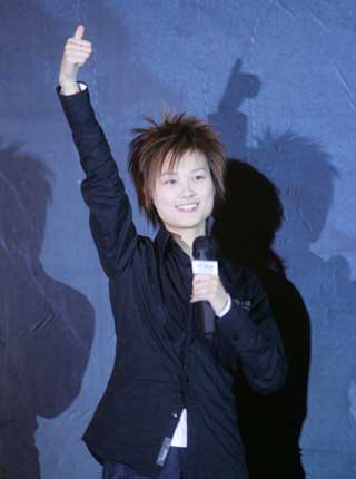Super Girl Li Yuchun gives a thumb-up at the signing ceremony in Beijing October 24, 2005. [newsphoto]