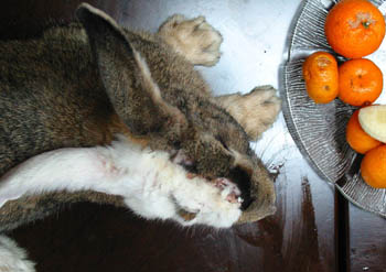 Chinese researchers show a rabbit with a gray and white face after a face-transplant operation at a plastic surgery institute in Xi'an, Northwest China's Shaanxi Province, December 23, 2005. [Newsphoto]