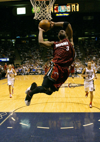 Miami Heat guard Dwyane Wade(3)stuffs the ball after breaking away from New Jersey Nets guard Jason Kidd (L) and forward Richard Jefferson (R) in the Game 4 of their NBA Eastern Conference playoff series in New Jersey, May 14. 2006. The Heat won the game 102-92 to take a 3-1 series lead.[Reuters]