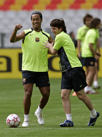 Barcelona preparing for the Final against Arsenal (Reuters) Updated: 2006-05-17 10:28  Barcelona's Ronaldinho of Brazil (L) trains with Lionel Messi