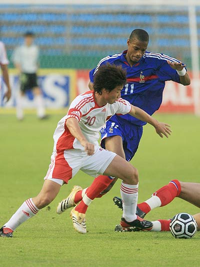 China's Chen Tao,left,challenges for the ball with France's footballers during their match in the Under-21 Toulon soccer Tournament, in La Londe, southern France, Tuesday, May 23, 2006.France set the score at 2-0 to reach the final. [sina.com]