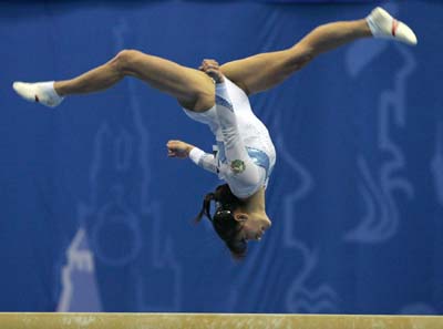 Oxana Chusovitina of Uzbekistan performs on the beam during the World Cup competition in Artistic Gymnastics in Moscow May 26, 2006. [Reuters]