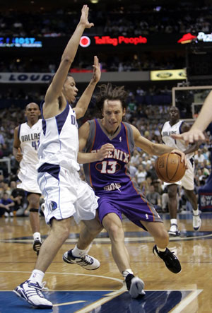 Phoenix Suns guard Steve Nash passes off as he is guarded by