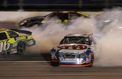 as he slides down the back stretch after colliding with Greg Biffle #16 Ford (L)